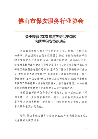 關于表彰2020年度先進保安單位和優秀保安員的決定